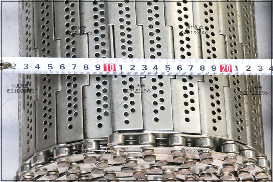 鏈板輸送帶是采用鏈條與板材加工成的,總寬度是70公分,長(zhǎng)度是10米,食品輸送機(jī)的傳送距離是5米,板厚采用1.5毫米不銹鋼304材質(zhì)的板材加工的,鏈條節(jié)距為50.8毫米的,桿直徑選擇為10毫米的。