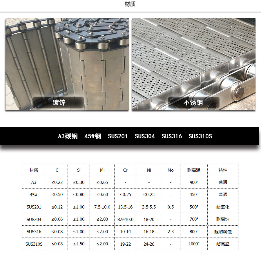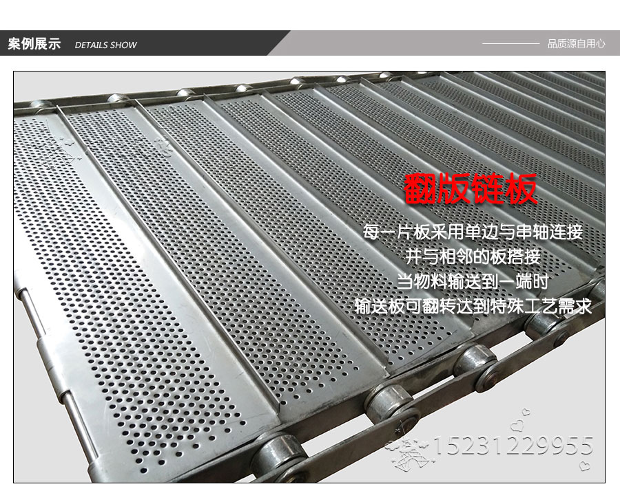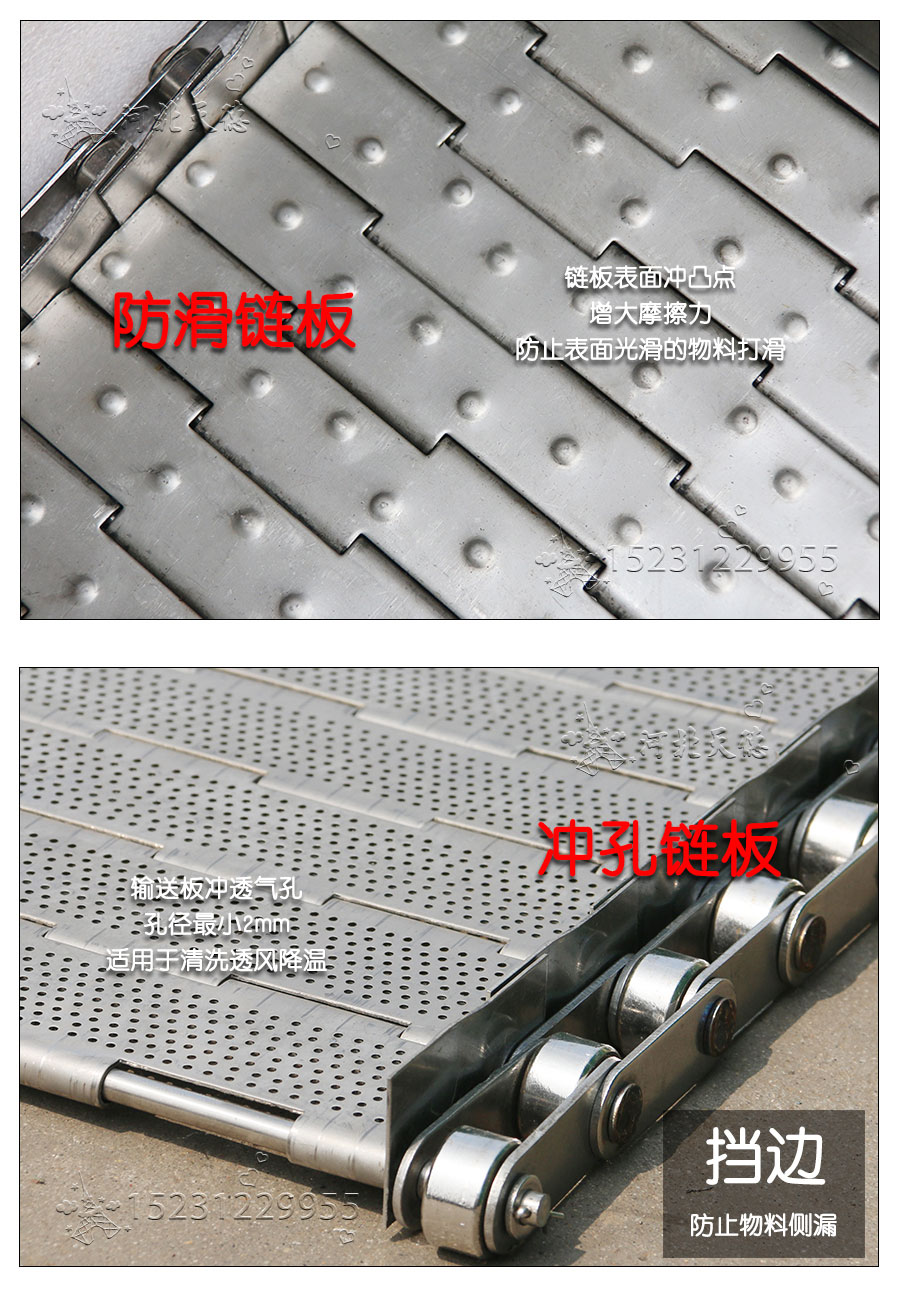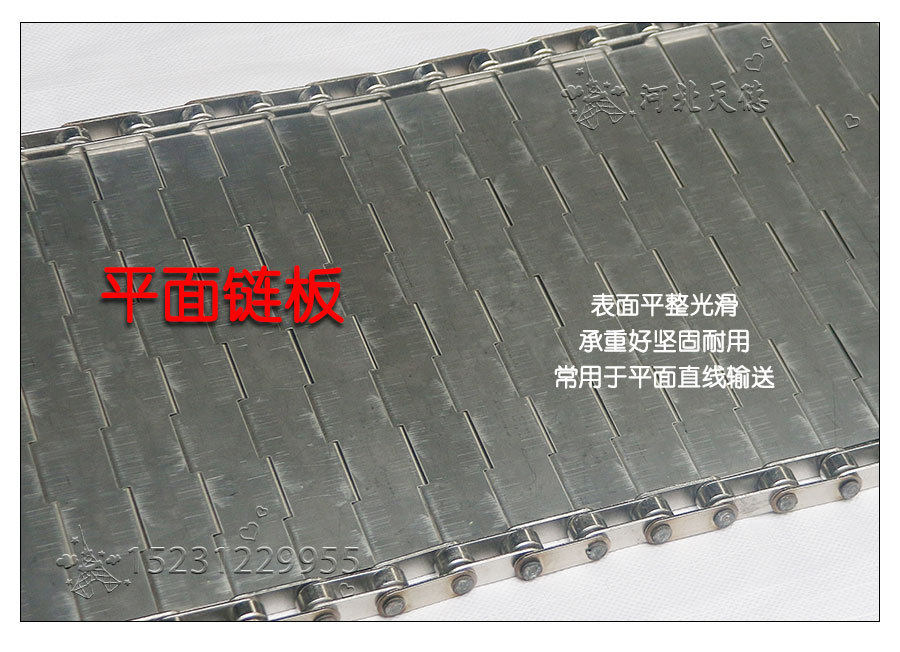 輸送鏈板非常堅(jiān)固由鏈條驅(qū)動(dòng)采用金屬板材生產(chǎn),適合用于輸送細(xì)小的高密度物件,輸送過程中運(yùn)轉(zhuǎn)平穩(wěn)安裝更換方便,成本相對(duì)較高使用壽命較長(zhǎng)用于中等和大負(fù)荷輸送。鋼板彎曲形成合葉,使用支軸將合葉和鏈條串在一起。兩端的鏈條可以使用開口銷或者墊圈來固定,使用開口銷方便拆卸,維護(hù)方便。