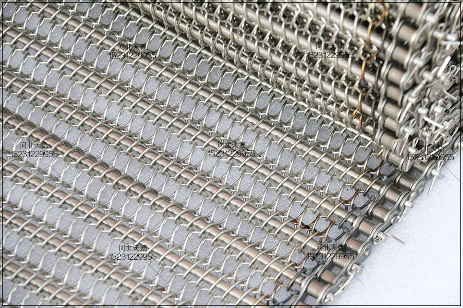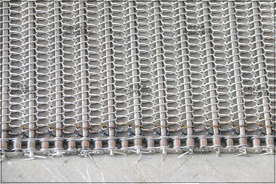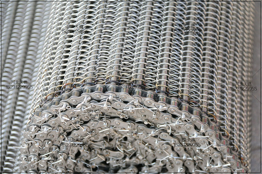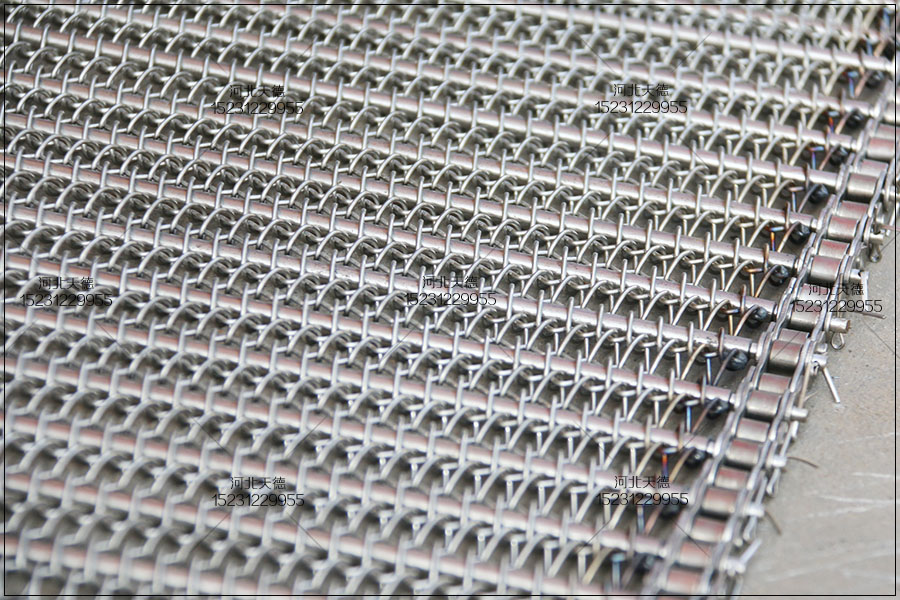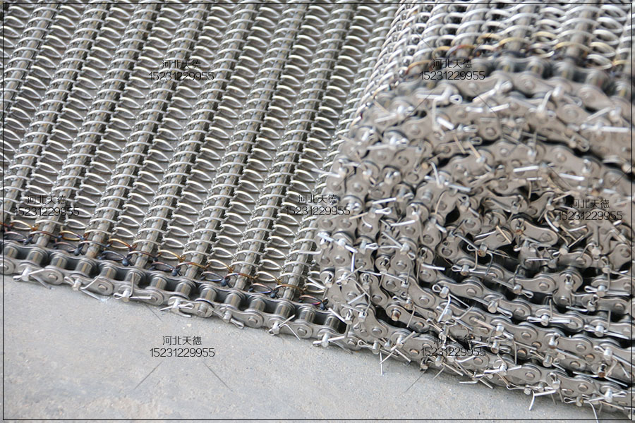 大滾珠輸送鏈輸送平穩(wěn),拉力大不跑偏,下面圖片展示的鏈條輸送帶總寬度是1米,長(zhǎng)度為30米,絲徑采用1.5毫米的鋼絲壓彎編織的,編織孔大小為8*15毫米的。
