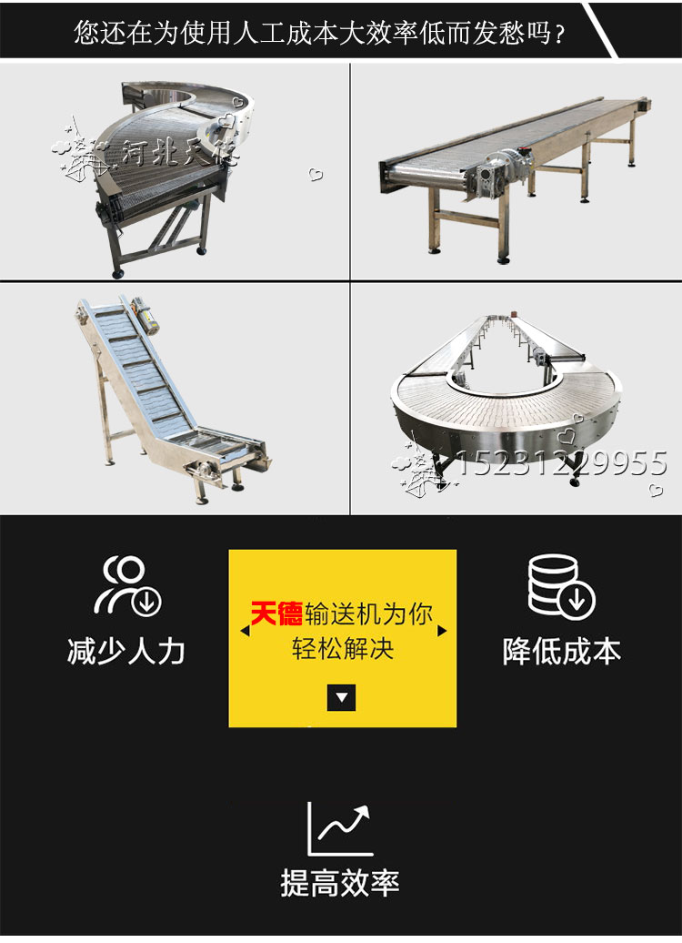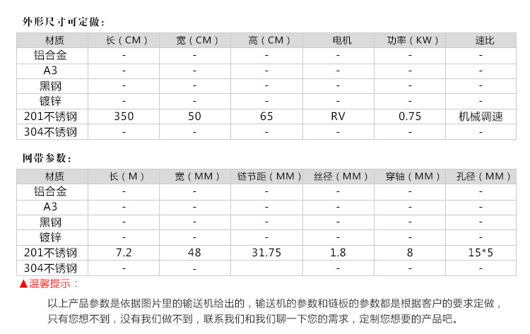 適用范圍:廣泛應(yīng)用于飲料瓶、鋁罐、藥品、化妝品、食品等行業(yè)的輸送,通過(guò)選用不同的網(wǎng)帶可以制作成儲(chǔ)瓶臺(tái)、提升機(jī)、殺 菌 機(jī)、蔬菜清洗機(jī)、以及肉食品輸送等行業(yè)專(zhuān)用設(shè)備??紤]網(wǎng)帶承受拉力限 制,單線(xiàn)長(zhǎng)度一般不超過(guò)20米。