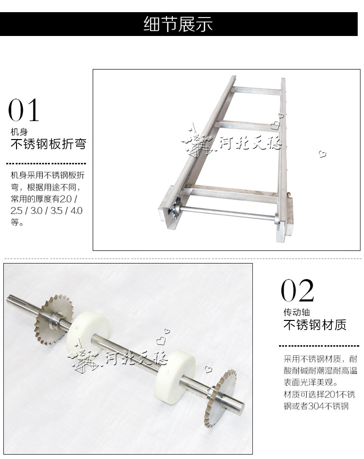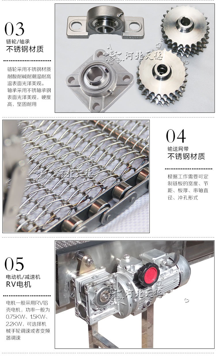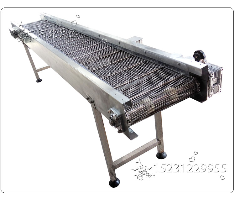 Structure: it's made up by sprockets, chains, wire mesh belt and dirve device, can choose different kind of wire mesh belts according to the goods' type, volume and weight.
