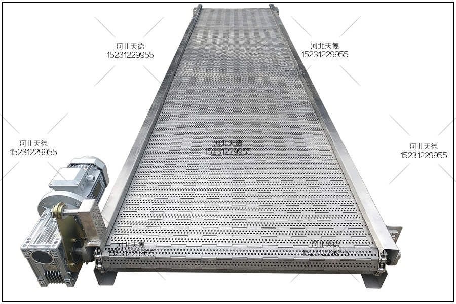 這臺鏈板不銹鋼輸送機(jī)的總長度為5米,輸送機(jī)總寬度為0.8米,沒有腿,客戶自己根據(jù)需要在焊 接機(jī)腿。采用3.0毫米厚度的鋼板折彎加工成的機(jī)身,不銹鋼鏈板輸送帶的板厚為2.0毫米,輸送鏈條節(jié)距為38.1毫米,桿直徑為8毫米,鏈板輸送帶表面打孔的直徑為3.0毫米。配套使用的鏈輪為直徑120毫米左右的。電機(jī)采用0.75千瓦電機(jī),配套使用的減速機(jī)、變頻器都會(huì)安裝好。